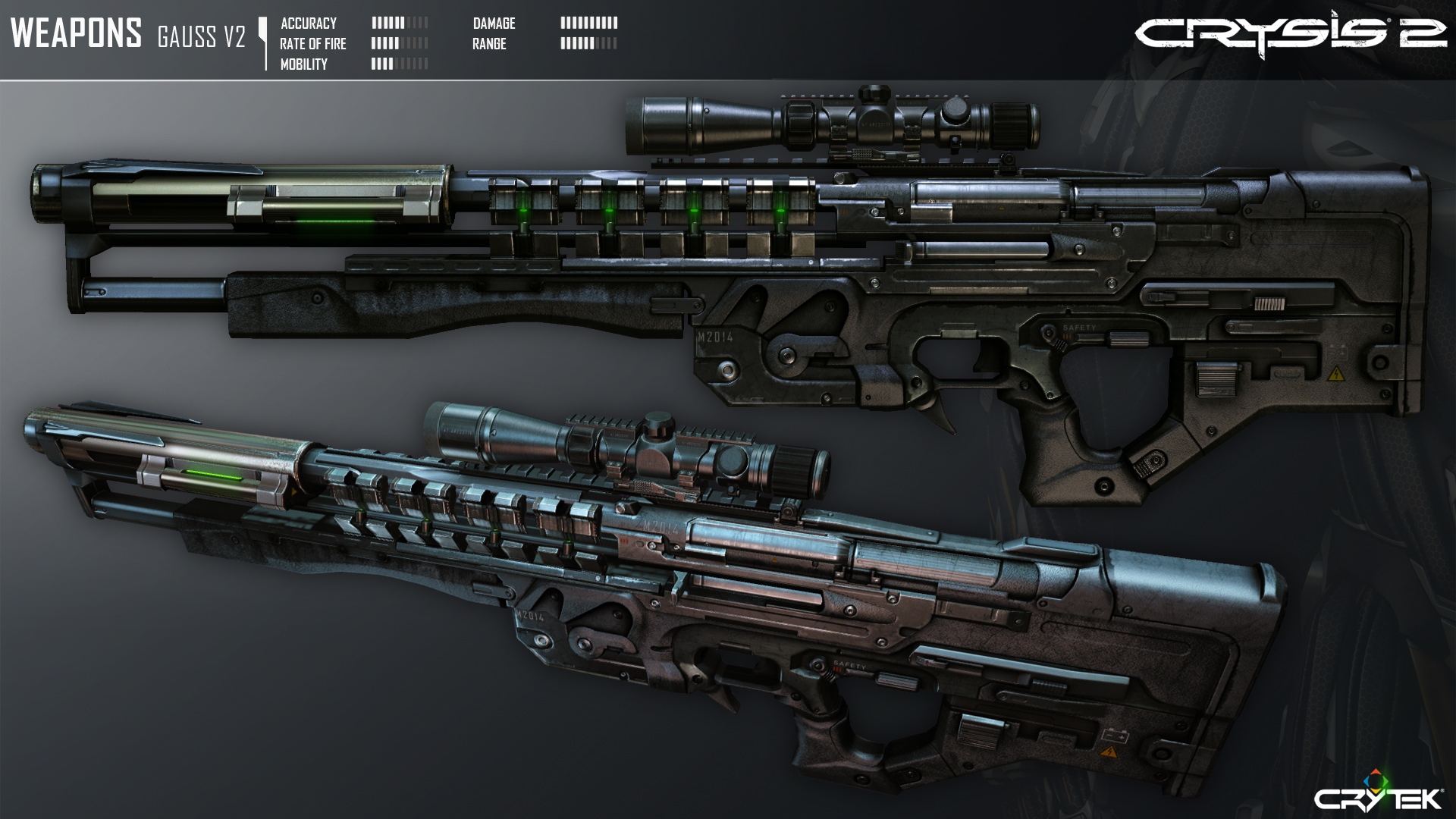 Винтовка Гаусса - мощная снайперская винтовка, работающая по принципу электромагнитного ускорения. Боеприпас, разогнанный до гиперзвуковых скоростей (порядка 8 скоростей звука), обладает огромной кинетической энергией, которая при попадании в цель моментально переходит в тепловую фазу, создавая взрывной эффект. Отличная замена огнестрельным крупнокалиберным антиматериальным винтовкам. В Crysis 3 именуется GAUSS SABOT.